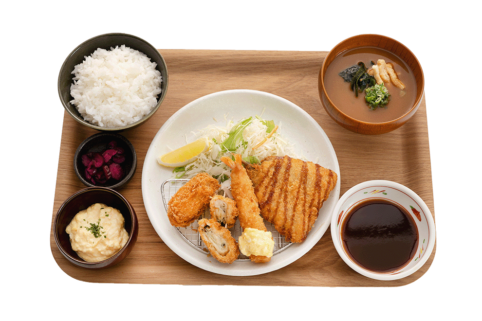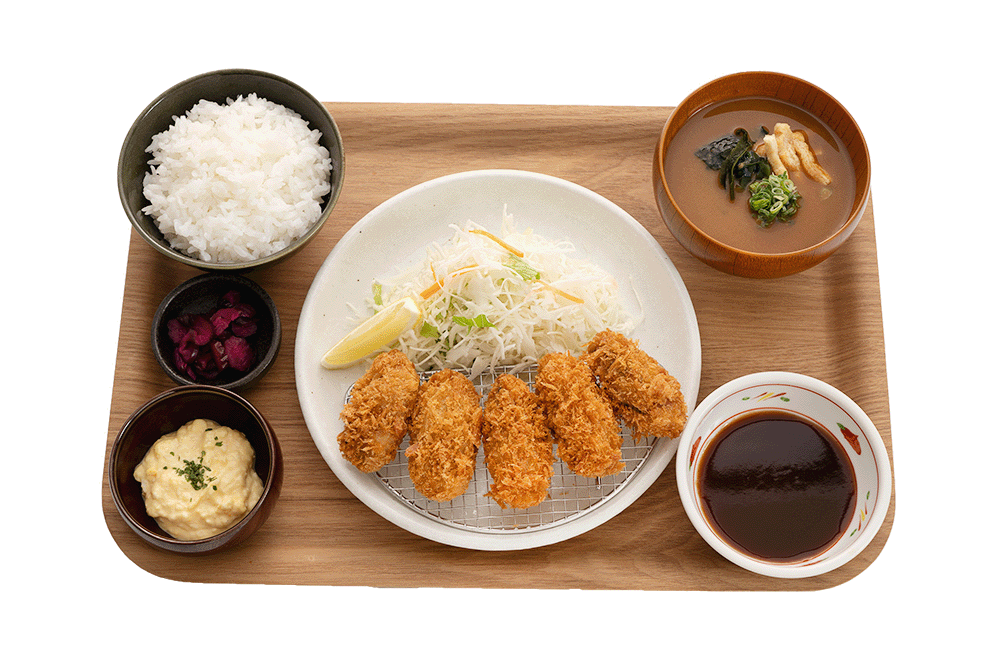 カキは「海のミルク」とも呼ばれ、乳白色の身にバランスよく栄養を含んでおります。そんな海の滋養を、風味豊かで濃厚なカキフライに仕上げました。「かきフライ定食」は風味豊かなカキフライを5個付けにしておりますので、自家製のタルタルソースとトンカツソースで濃厚なコクをお楽しみください。「かきフライミックス定食」はカキフライ2個に海老フライとアジフライがセットになった、ボリュームたっぷりでバラエティ豊かな定食です。