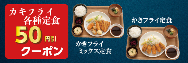 宮本むなし公式アプリでは「かきフライ各種定食50円引き」クーポンを配信いたします。