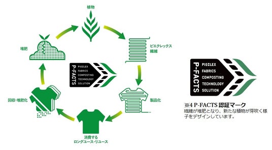 この循環インフラは、地域で使用された製品を地域で再利用する「地着地消地循」の考えに基づき、消費者が簡単に参加できる持続可能なファッション社会の実現を目指しています。「P-FACTS」に対応する製品には、「堆肥化し新しい植物を育む」ことを保証するP-FACTS認証マーク(※4)が付与されており、環境にやさしい選択肢を提供しています。