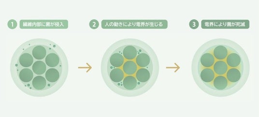 ピエクレックス独自の技術による、 '電気の繊維' の抗菌効果(※1)は、繊維自体が持つ抗菌性に基づいているため、洗濯を行ってもその効果は持続します。