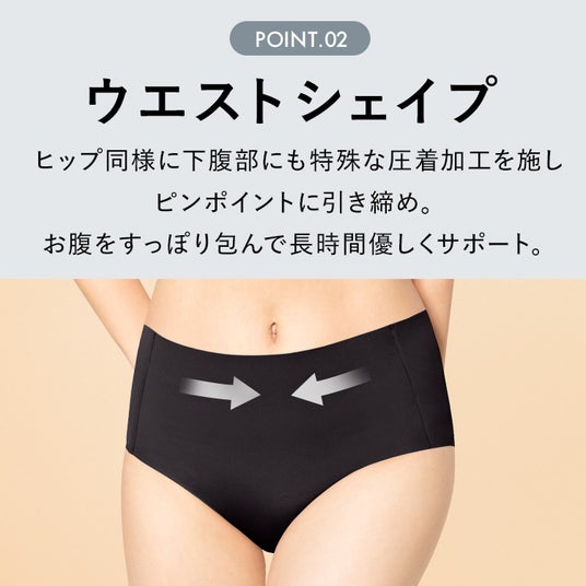 ◎ ウエスト シェイプヒップ同様に下腹部にも特殊な圧着加工を施し、ピンポイントに引き締め。