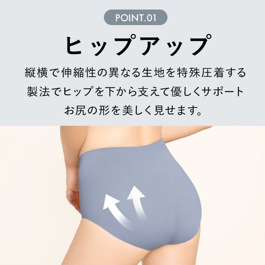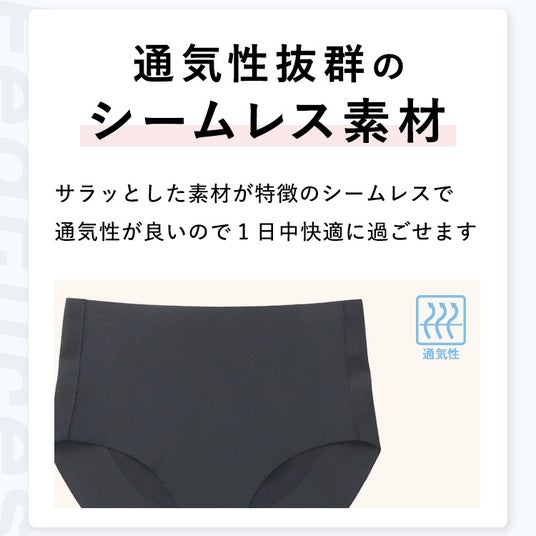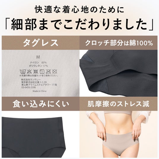 また、クロッチ部分には肌に優しい綿100%素材を使用し、デリケートな部分にも安心して着用できます。薄手で洋服に響きにくいシームレスデザインでありながら、しっかりとした生地感を持ち、日常のさまざまなシーンで活躍します。