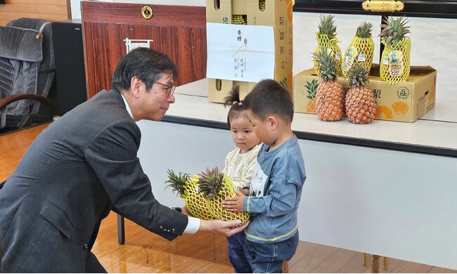 これらの事を背景に、郭国文立法委員様、野崎孝男台南市外交顧問様より、山口県内の10ヶ所の児童養護施設に、台南産のパイナップルを寄贈頂く事になり、丸久がお二方に代わって児童養護施設へお届けすることとなりました。これは、台湾の未来を担う子どもたち同士の国際交流発展を期待し、山口県の子どもたちに台湾に触れる機会を提供するためです。