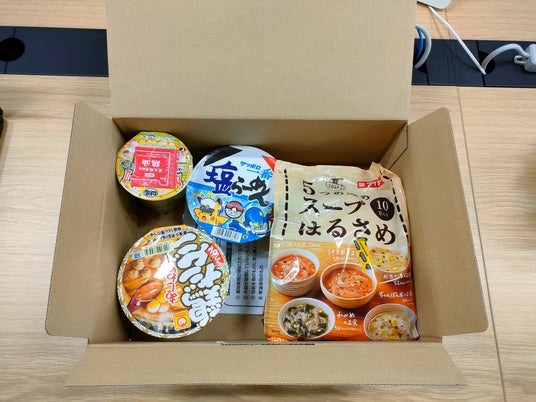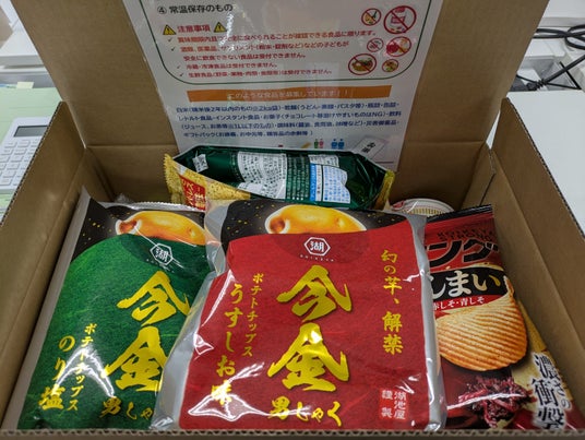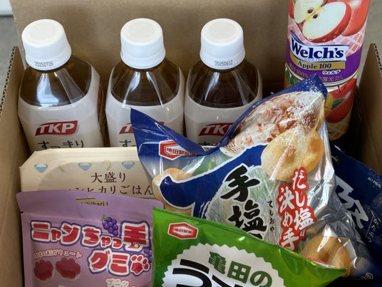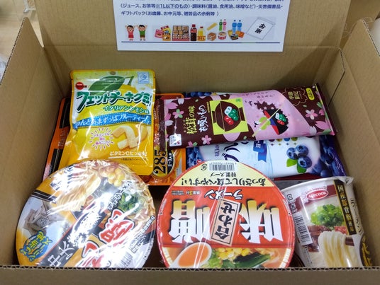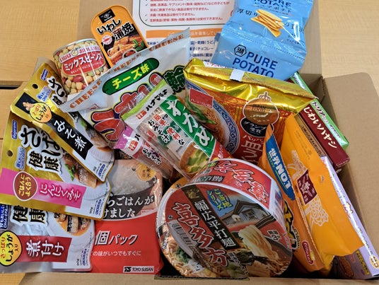お菓子(ポテトチップス・ビスケット・飴・クッキー・ゼリーなど)、インスタント食品(うどん・ラーメン・味噌汁など)、レトルト食品(カレー・パックご飯など)、缶詰(いわし缶・鶏照り缶・鰊フレーク・焼きのり佃煮など)、飲料(人参ジュース・トマトジュース・コーヒーなど)、その他(コーンフレーク・シリアルなど)
