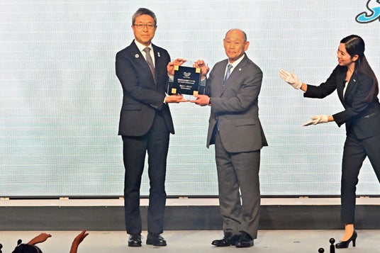 大同生命保険株式会社 代表取締役社長 北原睦朗様(写真左)から表彰楯を授与される岡山シーガルズ株式会社 代表取締役 山河義弘(写真右)