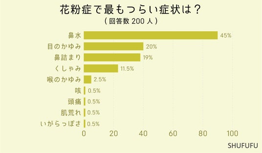 花粉症で最もつらい症状は?の問いに対して最も多かったのが「鼻水(45%)」でした。 次いで「目のかゆみ(20%)」「鼻詰まり(19%)」という結果でした。 50%以上の方が鼻水や鼻詰まりなど鼻の症状で苦しまれているようです。
