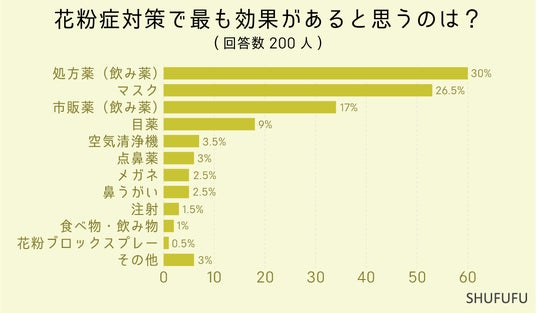 花粉症対策で最も効果があると思うものに関しては1位「処方薬(飲み薬)(30%)」、2位「マスク(26.5%)」でした。処方薬と市販薬を合わせると半分弱になりますので、飲み薬はかなり有効な花粉症対策のようです。