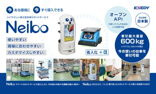 Neiboスマートロボットサービスは、「今ある環境」に「今すぐ導入できる」、人にやさしい進化型自律ロボットサービスです。自動車部品メーカーのエクセディが国内で開発・製造し、2024年9月から販売を開始しました。