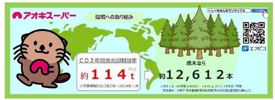 お客様のご協力により、2023年度は約874万枚(重量約57.8t)の食品トレーを店頭で回収し、 約114t分のCO2を削減いたしました。
