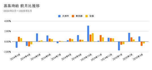 続いて、広島市中区・東京都・全国の募集時給を、それぞれ前月比の推移で比較します。最低賃金の引き上げがあった2024年10月は+2.0%近く平均時給が上昇しており、東京都や全国の上昇率を上回っていました。