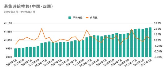 中国・四国エリアにおける、2022年3月から2025年3月まで3年間の募集時給を分析します。