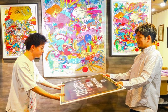 MUSASHIのアトリエに皇治が訪ねたり、MUSASHIからアートをプレゼントしたりと、約3年ほど前から交流を続けてきた2人。年齢やジャンルを超えてお互いをリスペクトし、応援し合ってきた。