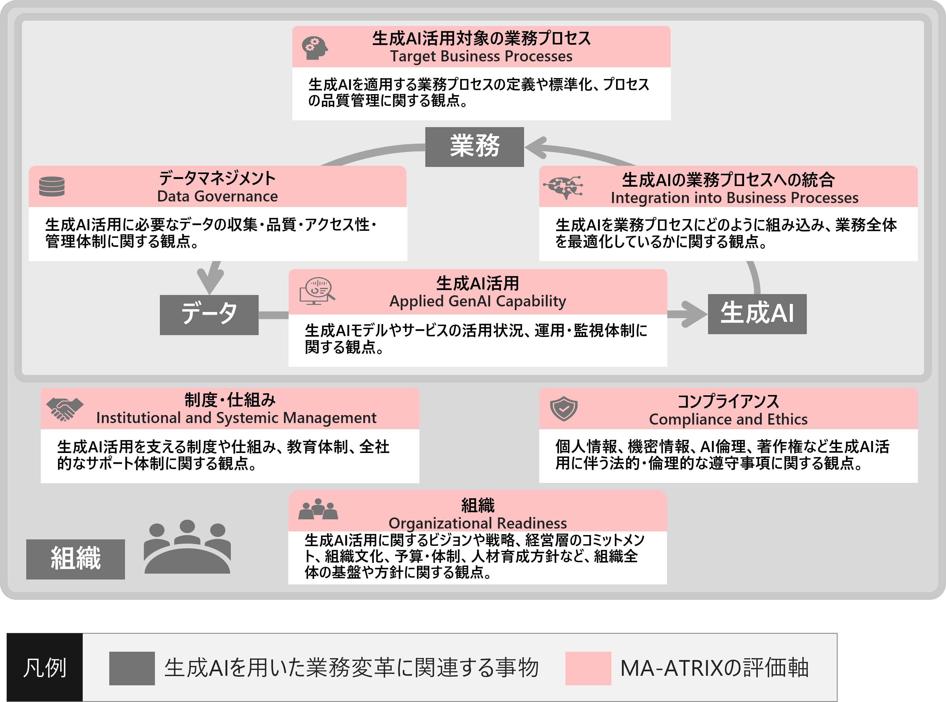 図 2 生成AI活用の成熟度モデル「MA-ATRIX」の7つの評価軸
