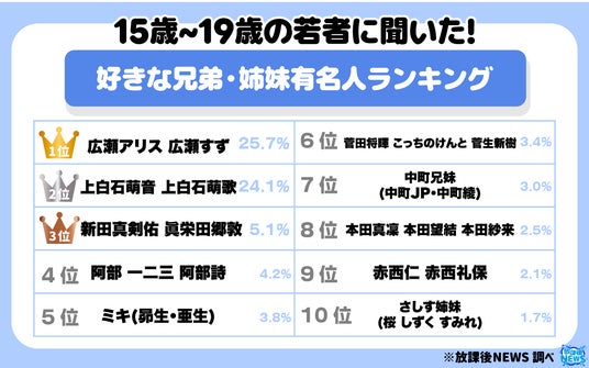 令和の若者に聞いた!好きな兄弟・姉妹有名人ランキングのTOP10以降と