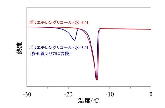 これに対して我々研究チームは、水がナノスケールの空間に閉じ込められると融点が低下する現象に着目しました。細孔径が既知のシリカ多孔体にPEG水溶液を含侵させ、示差走査熱量測定(DSC)※4により融点を測定したところ、通常のPEG水溶液に由来する高温側の融点に加え、ナノ空間に閉じ込められたPEG水溶液に由来する低温側の融点(低温側)が観測されることを確認しました(図1)。