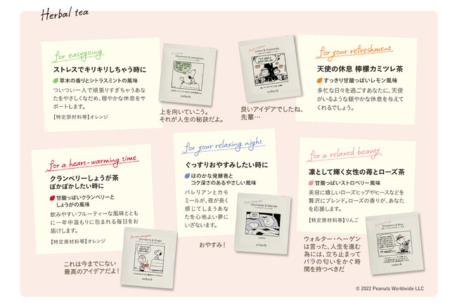 気持ちをほんのり楽にしてくれるスヌーピーたちからのメッセージとともに、香り豊かで華やかな色合いのハーブティーがリラックスシーンに寄り添います。
