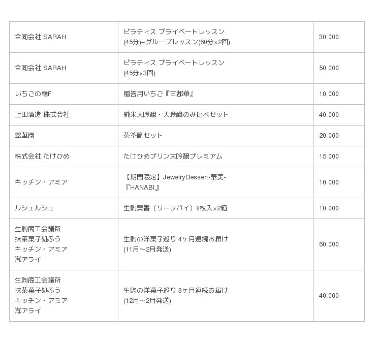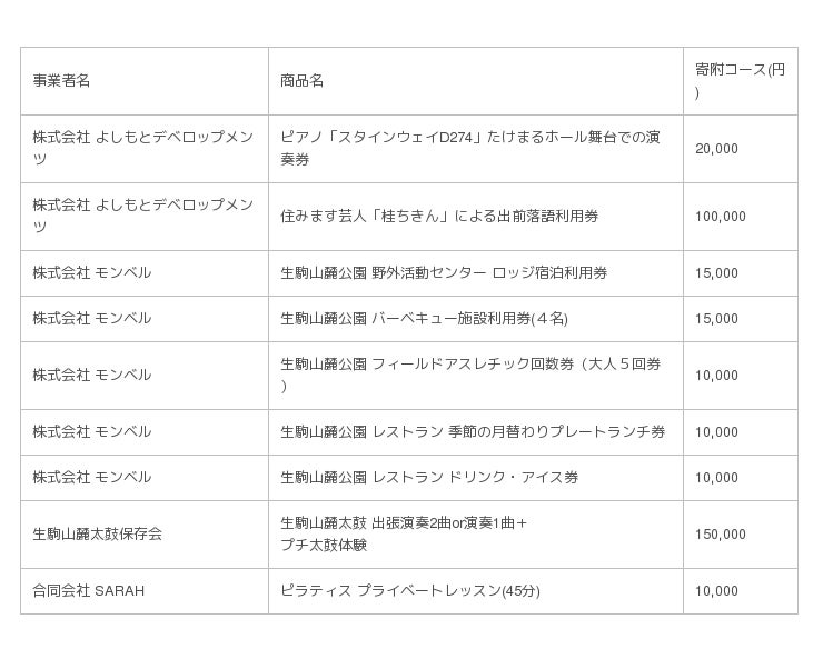 今年度は、19品の返礼品を追加し(下表)、そのうち11品は体験型返礼品です。コンサートグランドピアノの頂点を極める「スタインウェイD274」をたけまるホールで弾ける演奏券、住みます芸人「桂ちきん」による出前落語利用券、生駒山麓太鼓 出張演奏券、生駒山麓公園の利用券、ピラティスのプライベートレッスン券等、寄附者に生駒市へ足を運んでもらえる機会を創出することを目指し、体験型返礼品は全34品となりました。