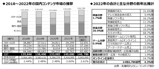(株)ヒューマンメディア(本社:東京/代表取締役社長:小野打 恵)は、2023年3月27日(月)に発刊した「日本と世界のメディア×コンテンツ市場データベース2023 Vol.16【速報版】」にて、2022年の日本のコンテンツ市場規模を推計14兆6,786億円(前年比4.3%増)と発表しました。