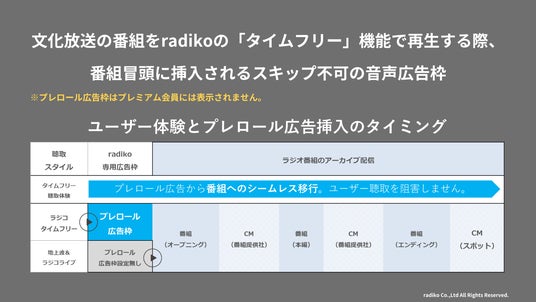 本プランは、文化放送の番組をラジコの「タイムフリー」機能で再生する際、再生開始直後に必ず流れるスキップ不可の音声広告(プレロール広告)を1社が1か月間ジャックする形式の広告メニューです。