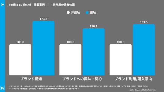 今回の正式リリースに先立ち、株式会社天乃屋(本社:東京都武蔵村山市)の「歌舞伎揚」を題材にした音声CMを用いてテスト配信を実施いたしました。radikoサーベイを通じたブランドリフト調査では、非接触者群を100%とした場合に、広告接触者群で以下のような大きなスコア向上が確認されました。
