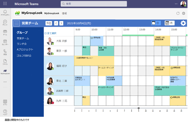 MyGroupLook for Microsoft Teams(以下:MyGroupLook)は、組織内のメンバーとの予定共有を効率的に行うTeamsアプリで、自分の使いやすいようにメンバーをグルーピングし、その時に見たい人の空き時間確認や予定調整を簡単に行うことができます。