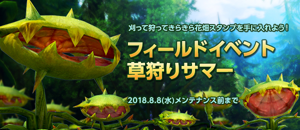 本日より、フィールドにイベントモンスターが出現する「草狩りサマー」イベントを開催いたします。街中に植物のイベントモンスターが出現し、討伐することで新たな足跡スタンプを獲得する事が出来ます。お花畑の足跡スタンプを手に入れて、アルボレアの夏を満喫しましょう。