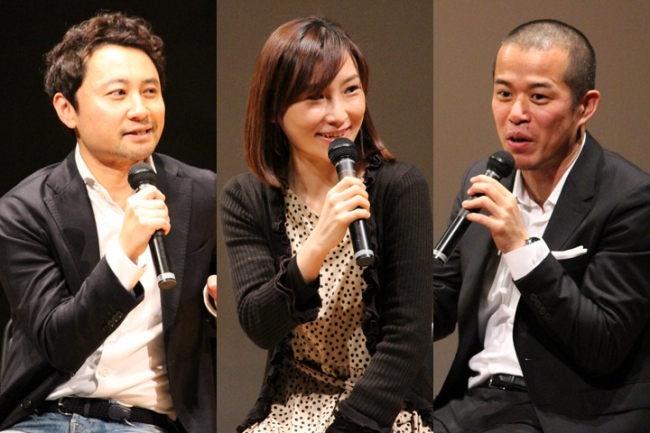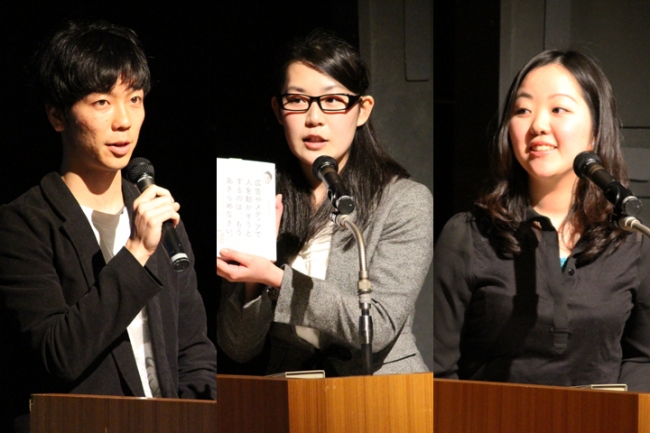 来場した学生たちの注目度の高かったトークショーに登壇したのは、2014年度広告関連書籍売上No.1『広告やメディアで人を動かそうとするのは、もうあきらめなさい。』(ディスカヴァー・トゥエンティワン刊)の共著者であるLINE株式会社上級執行役員の田端信太郎さんとブルーカレント・ジャパン株式会社代表の本田哲也さん、さらには電通、トレンダーズを経て現在はブロガー・作家として活躍するはあちゅうさんのお三方。