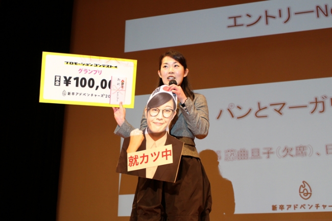 当日最終審査をしてくださったのは、広告・ネット業界の著名人であり、超人気企業の代表や役員クラスである11名のそうそうたるメンバーの方々。着眼・発想の面白さは? きちんと伝わるプレゼンテーションの構成となっているか? 企画の実現性はどれほどあるのか? 一流の仕事の現場で磨かれたプロ中のプロの審査員たちの厳しい目による審査の結果、見事グランプリに選ばれ、賞金10万円を獲得したのは「パンとマーガリンズ」というチーム。