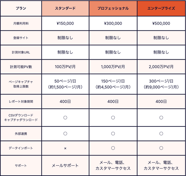 ※「ページキャプチャ取得上限数」が旧プランの「300ページ/日」から「150ページ/日」に変更となります。