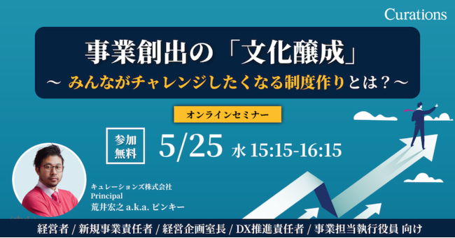 顧客企業のビジネス変革を成功に導くキュレーションズ株式会社(本社:東京都渋谷区、代表取締役社長:根本隆之、以下当社)は、『事業創出の「文化醸成」~みんながチャレンジしたくなる制度作りとは?~』を2022年5月25日(水)に開催いたします。