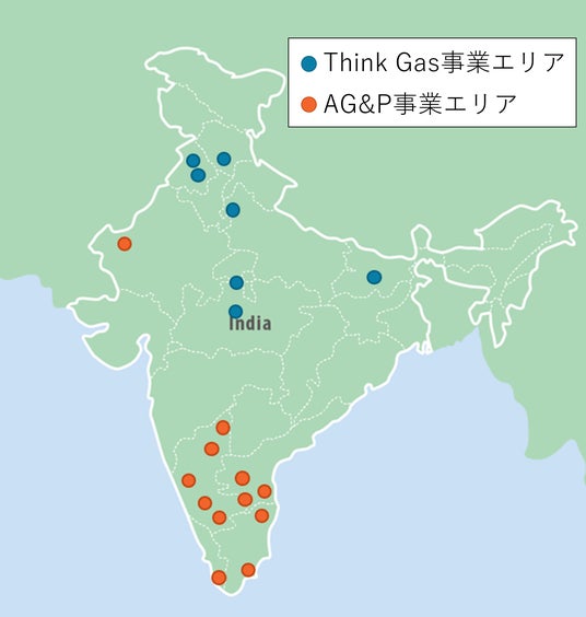 現在の事業エリアは、インド南部の郊外を中心としたAG&P事業エリアと、インド北中部の都市部を中心としたThink Gas事業エリアがあり、事業面積はインド国土の1割に相当する約32万km2(日本の国土の約9割)です。