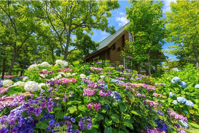 ホテル・ロッジ舞洲は大阪の中心部から車で約20分という場所にありながら、約12,000坪もの広大な敷地を有しています。広いガーデンには紫陽花をはじめ約300種類の草花が植えられ、海外から輸入した14棟のログハウスが立ち並び、三角屋根の光景は異国情緒にあふれています。