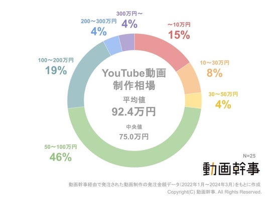 ・YouTube動画制作の平均相場は92.4万円。中央値は75.0万円