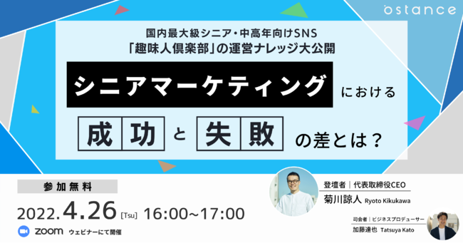 趣味人倶楽部を運営する株式会社オースタンス(本社:東京都新宿区/代表取締役:菊川諒人)は、「シニアマーケティングにおける成功と失敗の差とは?」をテーマにオンラインセミナーを、 2022年4月26日(火)16:00~17:00に開催いたします。
