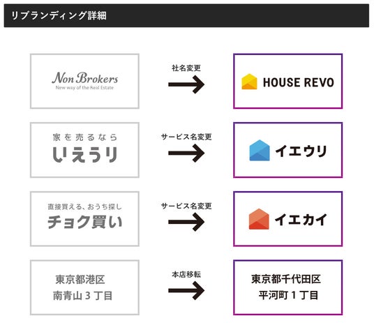 この度、「イエウリ」「イエカイ」にサービス名を変更し、新たなロゴマークで新ブランドに生まれ変わります。「HOUSE REVO」が目指すビジョン・ミッションを浸透させ、従来の不動産取引における煩雑さや不透明さ、心理的負担を根本的に解消し、これまで以上の「顧客中心主義」を体現するため、より力強い統合的なブランド・アイデンティティを確立することを目指します。