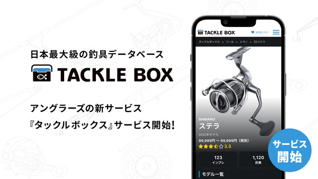 釣果記録ができる釣りSNS「ANGLERS」を運営する株式会社アングラーズ(本社:東京都町田市、 代表取締役:若槻嘉亮)は、2万点以上の釣具が比較できる、日本最大級の釣具データベース『TACKLE BOX』のサービスを開始いたしました。