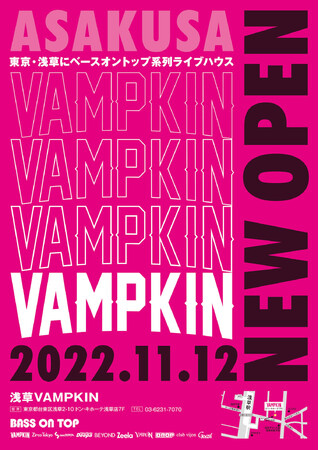 関東・関西にライブハウス、スタジオを展開する株式会社ベースオントップ(本社:大阪市天王寺区 代表取締役:水守 宏)は、2022年11月12日(土)東京・浅草にベースオントップ系列ライブハウス10店舗目となる新店舗【浅草VAMPKIN】をオープンいたします。