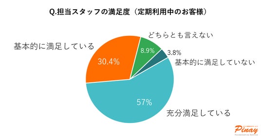 ピナイ家事代行サービスを定期契約いただいているお客様(回答数:79)に担当スタッフの満足度を5段階聞いたところ、57%が「5:充分満足している」、30.4%が「4:基本的に満足している」と回答。87.4%以上が満足している結果となりました。