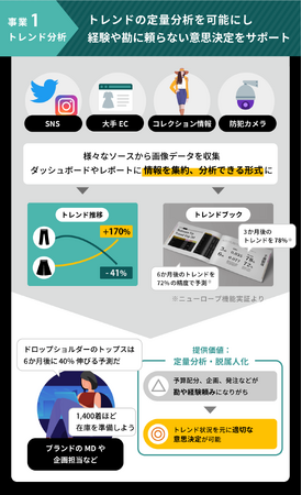 特にトレンド分析事業では、SNSなどから収集したファッションスナップから数か月先のトレンド状況の予測値を参照することができます。現段階のニューロープによる機能実証では、6か月先は72%、3か月先は78%程度の精度でトレンドの方向感を的中させられる状態です。