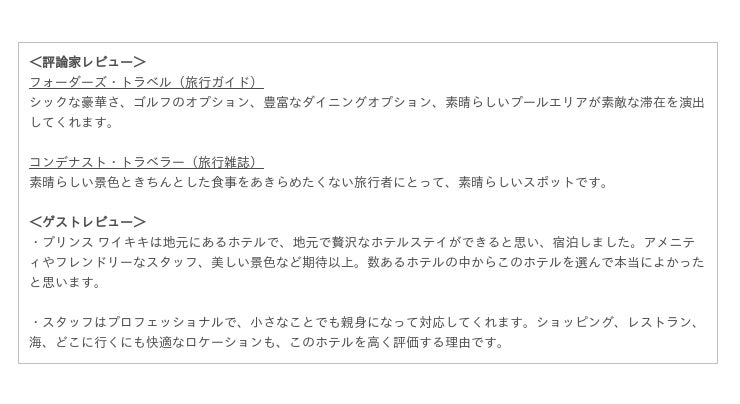 行き届いたサービスを提供するスタッフと、居心地の良い客室に対して特に高評価を得ました。プリンス ワイキキは全ての客室に、液晶スマートテレビ、無線インターネット、ミニ冷蔵庫を完備。また、全室オーシャンフロントであるためどの客室からも海を眺めることができます。アラモアナセンターとアラモアナパークはホテルから1.6kmと徒歩圏内、ワイキキとアラモアナの中心に位置し、便利な立地がホテル最大の特徴です。また、インフィニティープールをはじめとするホテル内の施設や、27ホールを有する広大なゴルフコースも高く評価されました。