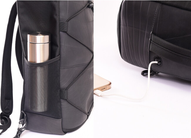 ベーシックなブラックカラーでまとめ、素材には廃タイヤと1680dナイロン、止水ファスナーを使用しています。防水性と耐久性に優れているので旅行用のトラベルバッグとして、また手荷物が多い外出時にも場所や環境を問わず様々なシーンでご使用いただけます。