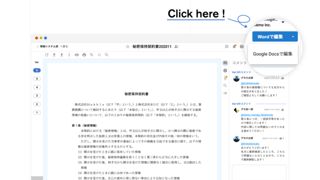 Google Docsでも編集可能に。事業部門がWordライセンスを持っていなくても、正しくバージョン管理。最適なフロー構築へ