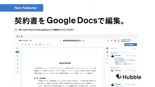 ドキュメント編集の手段がWordに限らなくなったこの時代に、Hubbleはドキュメント編集をWord、Google Docs問わず可能にし、完璧なバージョン管理・契約業務を実現します。