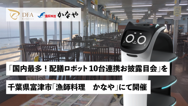 飲食店DXを推進するロボティクスソリューションカンパニーである株式会社DFA Robotics(本社:東京都渋谷区、代表取締役社長:波多野 昌昭)は、提携するPudu Robotics社(本社:中国深セン、日本法人Pudu Robotics Japan 株式会社 代表取締役社長:張涛)が提供するネコ型配膳ロボット「BellaBot(ベラボット)」において国内最多となる10台稼働を実現し、千葉県富津市の食事処「漁師料理 かなや」にて、報道関係の皆様に向けたお披露目会を3月14日(火)に開催したことを報告いたします。