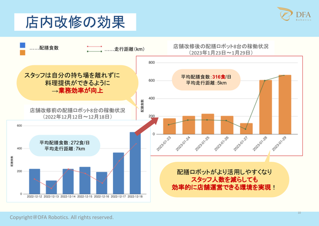 2022年12月にはさらなる業務効率向上のため、調理場の改修を行い、複数台のロボットがデシャップ前で待機できるように通路を拡張。これまで客席横で待機していた配膳ロボットの元へと料理を運んでいましたが、スタッフは調理場から離れず業務が可能となり、ロスタイムのない店舗運営が可能となりました。結果、店舗改修前の平均配膳食数272食から、店舗改修後は316食と効率的な店舗運営を実現しました。