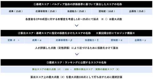 「基礎スコア」「算出スコア」「最終スコア」の三段階の評価プロセスを経て、キャンペーンの総合評価を行い、最終的にランキングを決定しております。