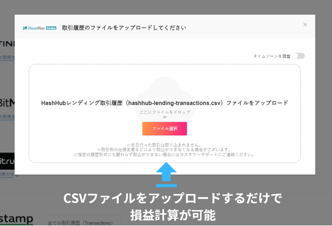 『HashHubレンディング』からエクスポートできる取引履歴をGtaxにアップロードするだけで簡単に損益計算を行うことができます。