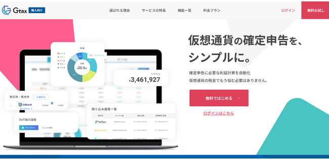 暗号資産の損益計算サービス「Gtax」は、暗号資産の取引によって発生する利益額(損失額)を自動で計算できるサービスです。国内外合わせて50以上の取引所・暗号資産関連サービスの履歴に対応しており、確定申告期には多くの暗号資産投資家に選ばれています。