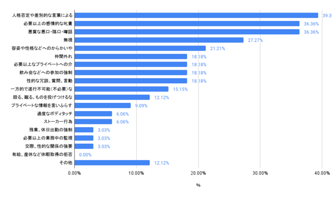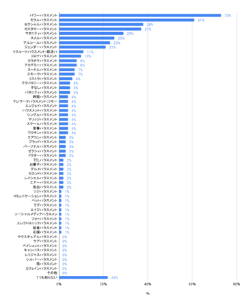 33%の人が、ハラスメントを受けた経験があるようです。最も多かったのは、21%のパワーハラスメントでした。