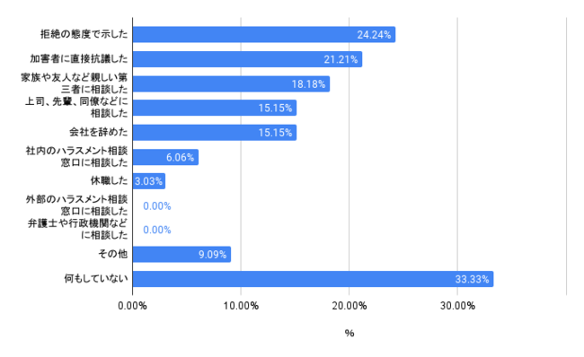 60%以上の人がハラスメントに対して何らかの対応ができているようですが、まだ30%の人は対応が何もできていない状態です。